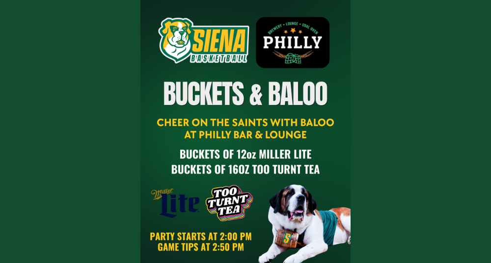 Buckets & BalooCheer on the Siena Saints in the tournament with Siena's mascot Baloo at Philly's Bar and Lounge in Latham.