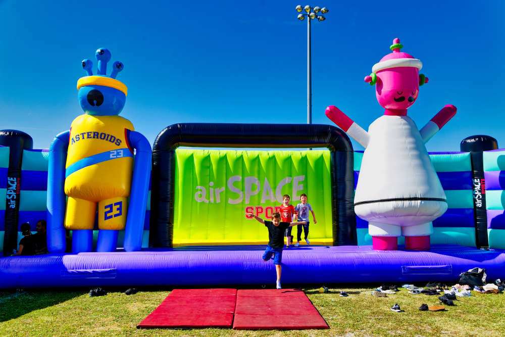 The main attraction is the World’s Biggest Bounce House, which spans about 24,000 square feet and stands roughly 32 feet tall. Inside, you’ll find giant slides, climbing towers, basketball hoops, ball pits, and a full-on party atmosphere with a live DJ keeping the energy going.