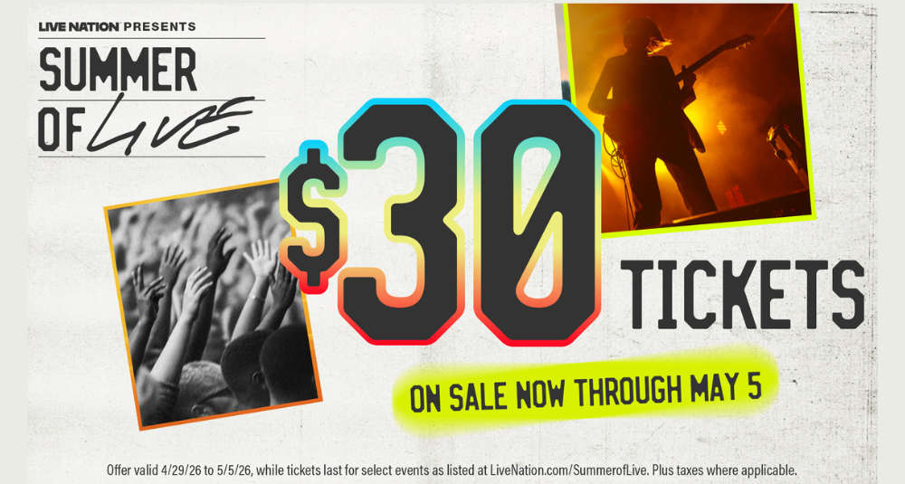 LOCK IN YOUR SUMMER CONCERT CALENDAR WITH YOUR “SUMMER OF LIVE” $30 ALL-IN TICKET, AVAILABLE BEGINNING WEDNESDAY, APRIL 29TH THROUGH MAY 5TH, WHILE SUPPLIES LAST AT LIVENATION.COM!